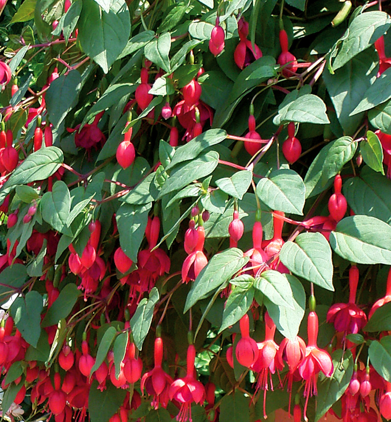 Viseča fuksija tvori dolge, povešene poganjke, ki se hitro prelivajo čez rob balkonskega korita ali viseče posode.